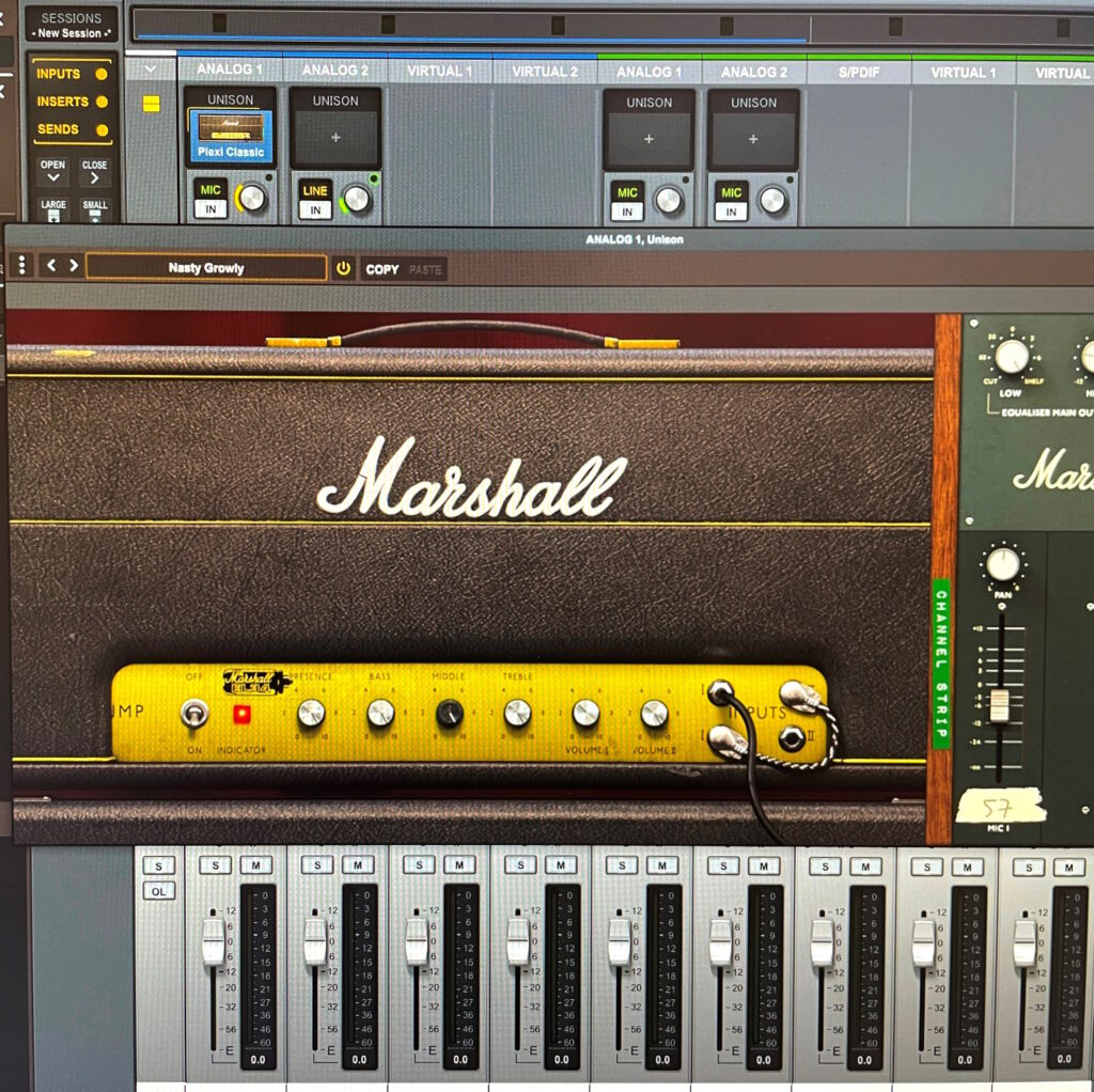 上記アンプの再現。マーシャルに電源を入れたときのチリチリ感が耳から聴こえてきて感動する。スケール感のあるギターを録りたいときに活用。