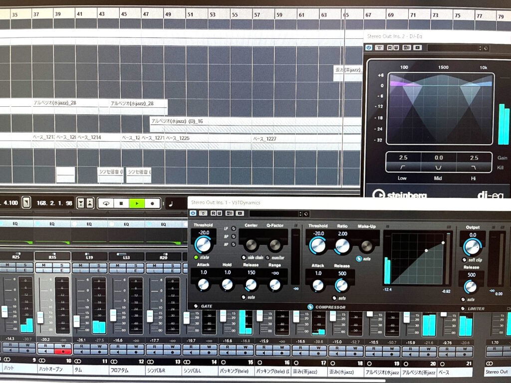 Cubase 9.5になっても使い方が複雑になることはなく快適。内蔵のプラグインエフェクターを少々使いながら録音とミックスを進めている。
